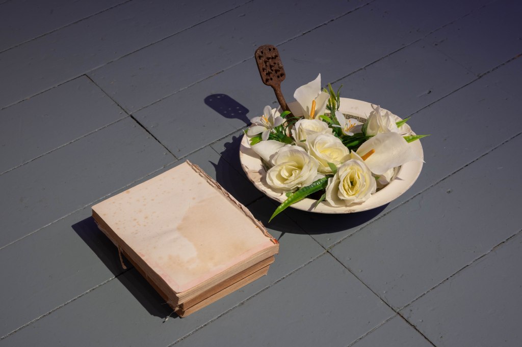 The Doll’s House, Goldscheider porcelain, wooden object, brass scales, pigment, moss, linen, curtain rail, curtains, wooden disk, crepe paper and gold paint, Dimensions variable, 2024